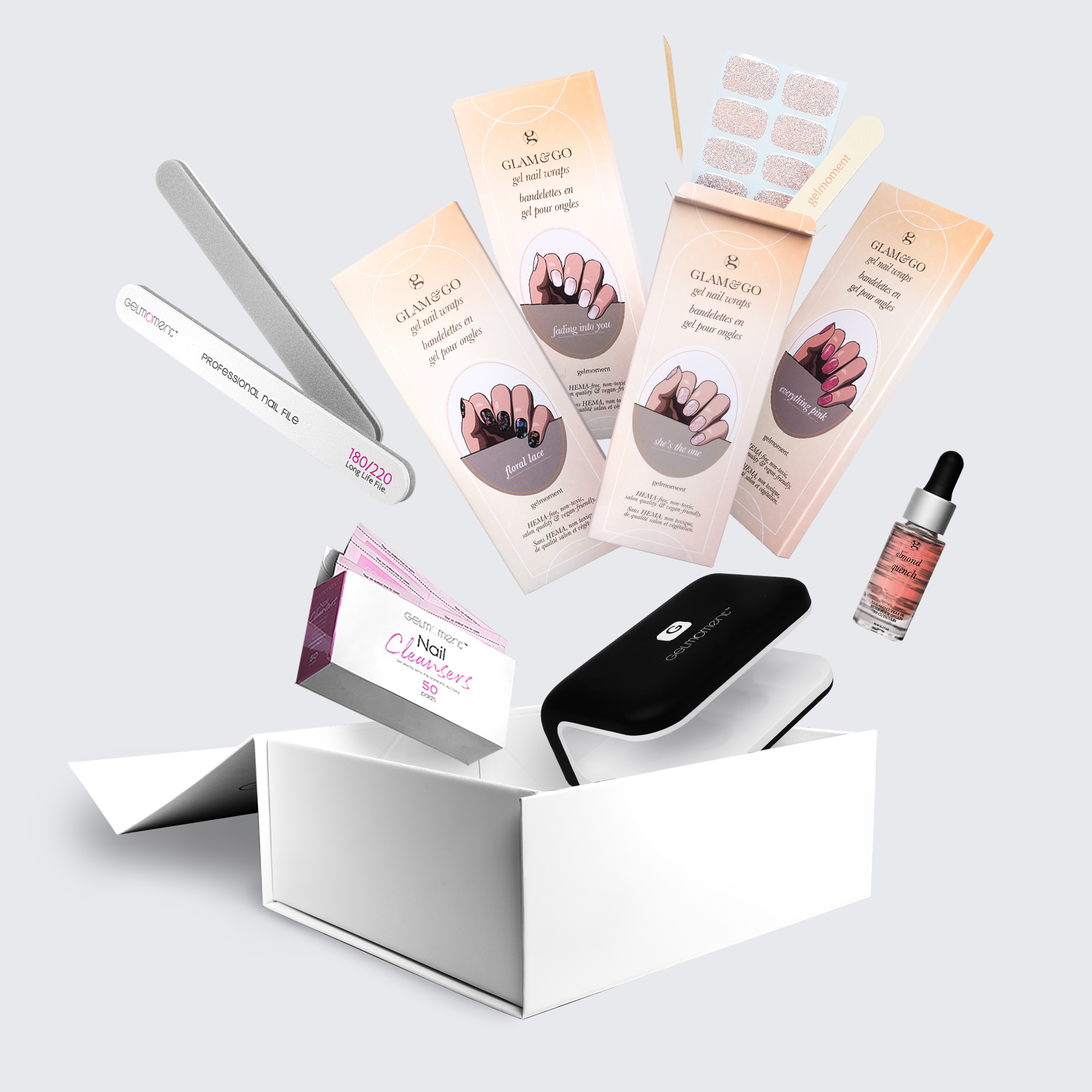 Gelmoment glam & go gel nail wraps are convenient, easy to use, and glamorous. Our 2 customer kit options contain all the essential products you need to try them out and experience it for yourself: A beautiful DIY gel manicure really is as simple as glam & go.